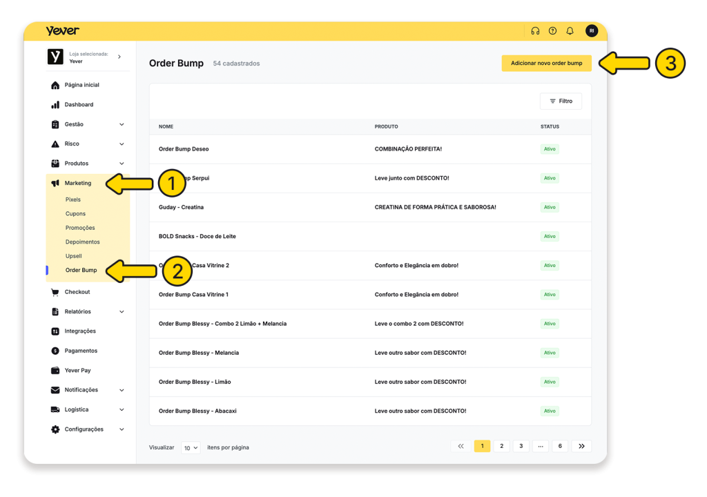 Menu lateral esquerdo do painel Yever → Marketing → Order Bump. Aqui você vê todas as ofertas existentes.
