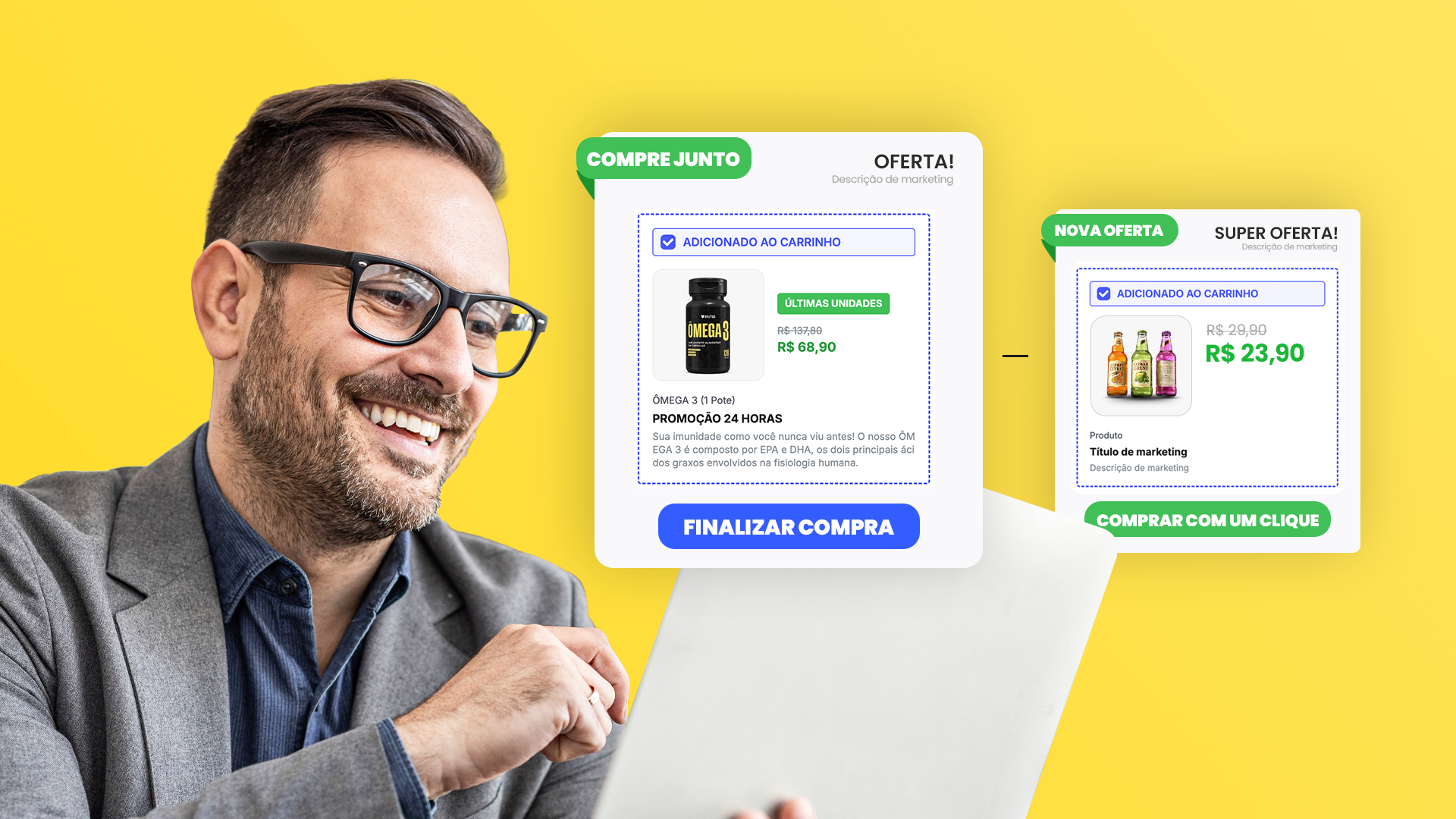 - espaço para prova social, selos de segurança e Order Bump, ajudando a aumentar ticket e confiança no momento da decisão.
